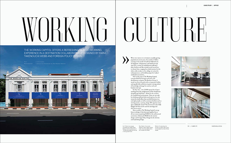 Log on to Cubes Extras on www.indesignlive.sg for more on the wayfinding and identity design of The Working Capitol by Foreign Policy Design.