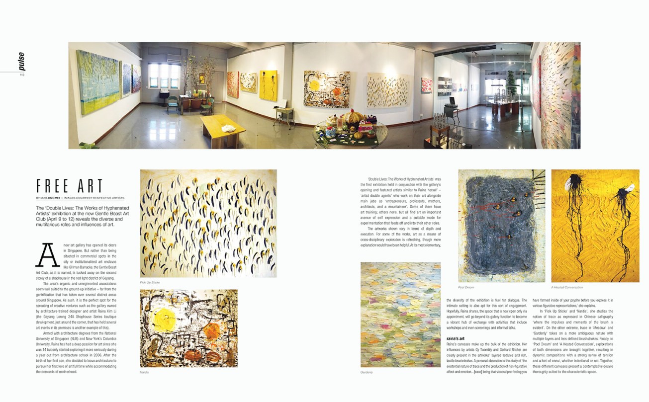 ‘Double Lives: The Works of Hyphenated Artists’ was the first exhibition held in conjunction with the gallery’s opening and featured artists similar to Raina herself – “artist double agents” who work on their art alongside main jobs as “entrepreneurs, professors, mothers, architects, and a mountaineer”. Some of them have art training; others none, but all find art an important avenue of self expression and a suitable mode for experimentation that feeds off and into their other roles.