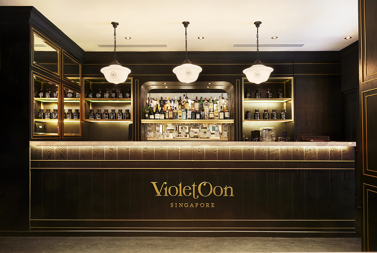 This corner is a key aspect of the identity of the brand, says Cherin. “To fully complete the ‘Violet Oon experience’, we wanted to carve out an area to represent her life and the colourful experiences and milestones that led her to where she is today. In this corner are a wall unit and an island unit that are designed to look similar to the ubiquitous kitchens that can be found in peoples’ abodes,” says Cherin. “We wanted guests to experience this space and feel as though they were in Violet’s very own home, hence the choice of a deep emerald green, which mirrors the influence of colours found in Peranakan tiles. We wanted to inject a value-added experience where guests can even see [for instance], desserts being flambéed before their eyes before being served to them,” she says.