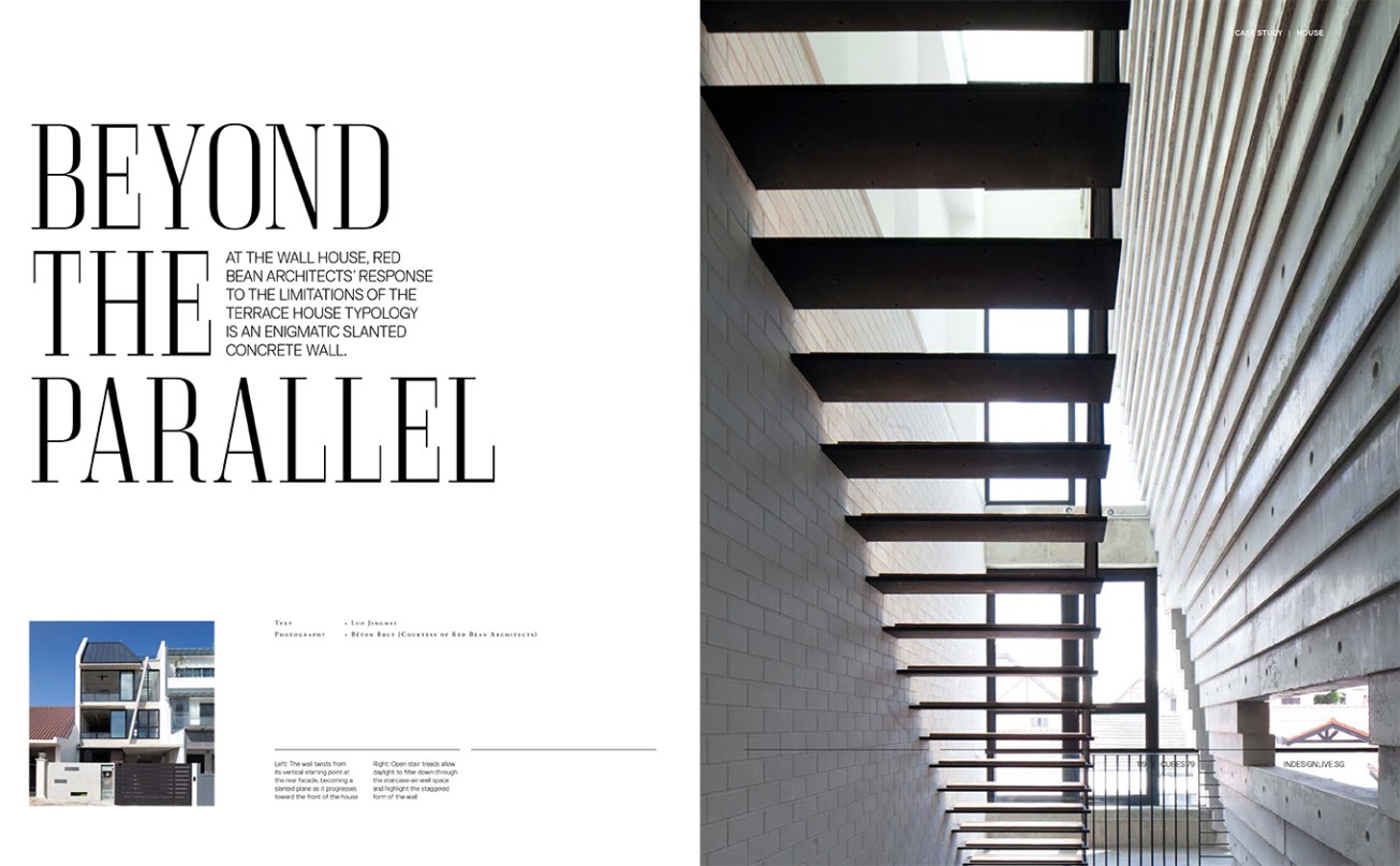 Architect Teo Yee Chin of Red Bean Architects is clearly very focused in his architectural experiments. Each of the homes he has designed is defined by a well-expressed, singular datum where function equals form. A recent example is the Wall House for a couple with two young children and frequently visiting parents. The wall in the name is a strongly articulated concrete wall slicing through the length of the house – a gesture Teo employs to explore a new kind of engagement within the terrace house (or row house) typology.