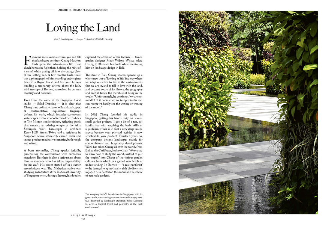 Even from the name of his Singapore-based company, Salad Dressing, it is clear that Chang is no ordinary creator of plant landscapes. A contemplative, explorative language defines these worlds that span from curvaceous waterscapes reminiscent of hilly rice paddies in The Minton condominium, and reflective pools embracing an existing temple in the Alila Seminyak resort, to hardscapes in architect Kerry Hill’s Aman Tokyo and a house in Singapore where rocks and stones intricately carved out Japanese craftsmen are placed to produce meditative sceneries both rough and refined.